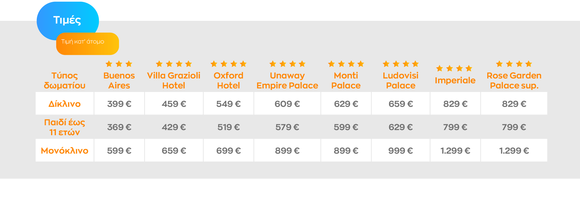 - Δημοτικός φόρος της Ρώμης € 7.5 (για τα 4* ξενοδοχεία) / € 6 (για τα 3* ξενοδοχεία) την ημέρα ανά άτομο