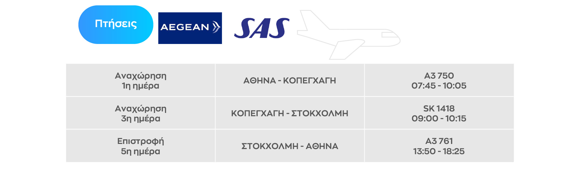 - Αεροπορικά εισιτήρια ΑΘΗΝΑ – ΚΟΠΕΓΧΑΓΗ / ΣΤΟΚΧΟΛΜΗ – ΑΘΗΝΑ με AEGEAN AIRLINES με μία αποσκευή έως 23 κιλά και μία χειραποσκευή έως 8 κιλά