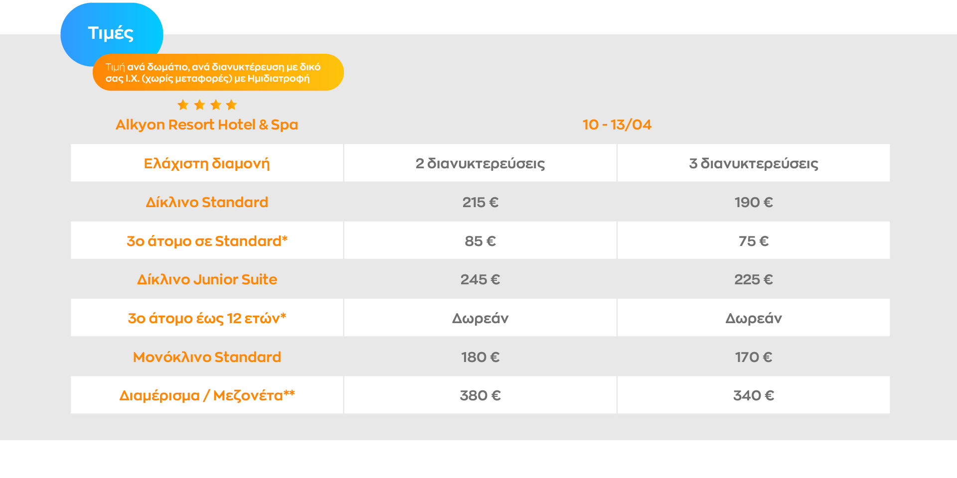 - 1 Ενήλικας και 1 παιδί έως 11 ετών σε standard δίκλινο δωμάτιο, χρέωση μονόκλινου.