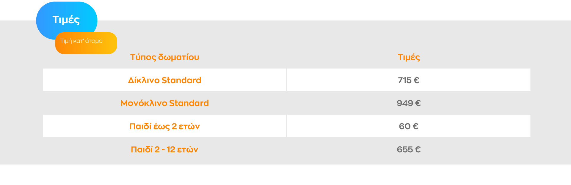 *Οι τιμές των παιδιών, ισχύουν όταν αυτά αποτελούν 3ο ή 4ο άτομο.
