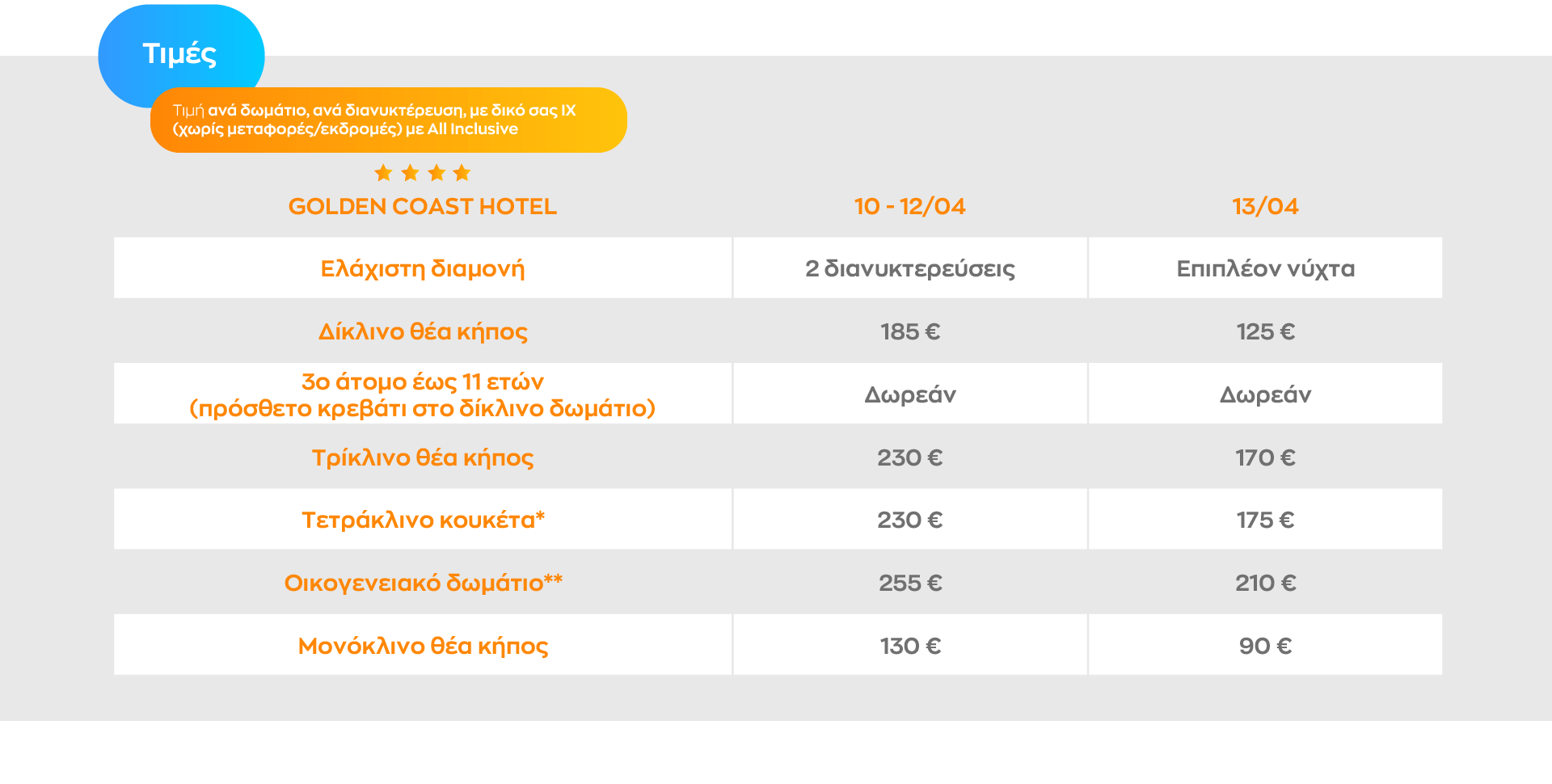 *συνολική τιμή για 2 ενήλικες + 2 παιδιά έως 11 ετών