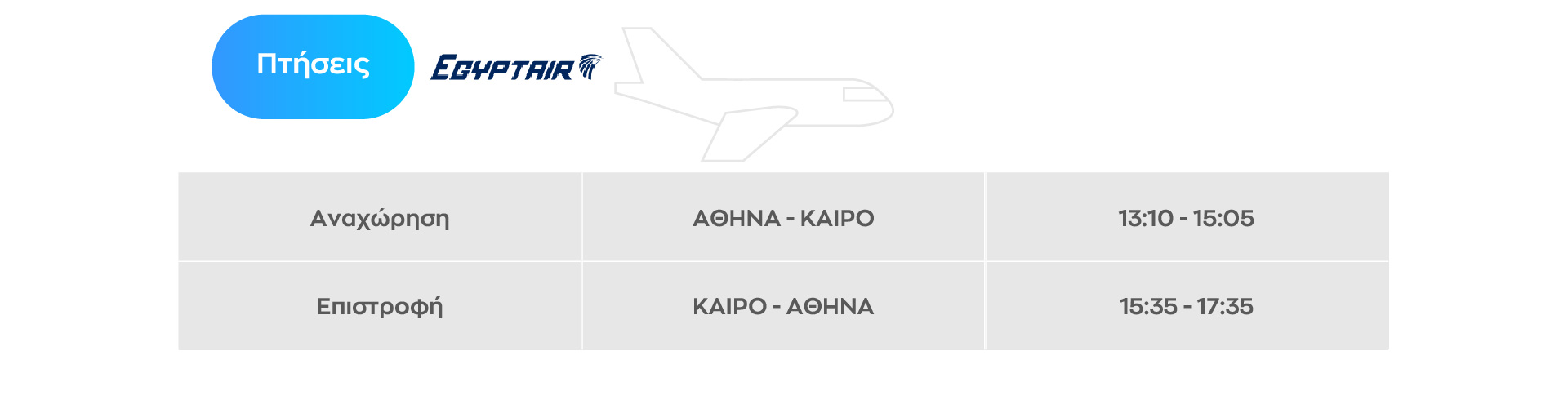 - Αεροπορικά εισιτήρια (οικονομική θέση): Πτήσεις Egypt Air & δύο εσωτερικές πτήσεις