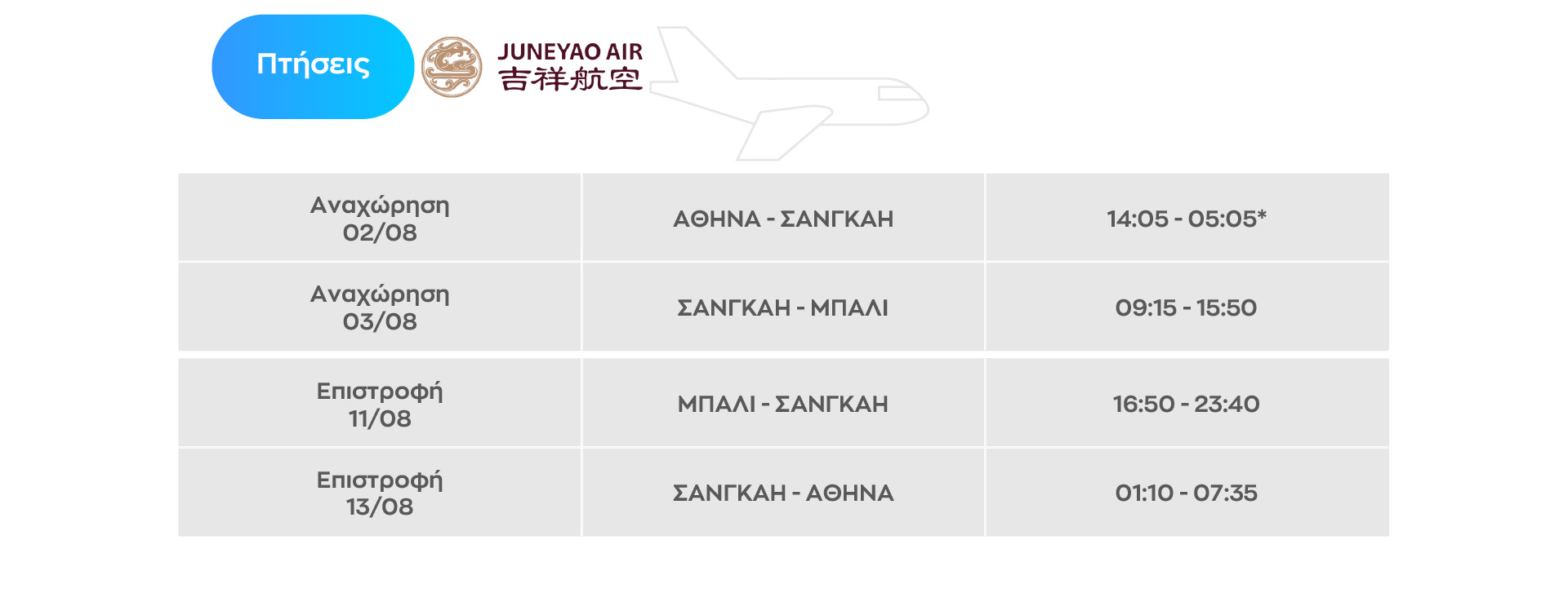 - Αεροπορικά εισιτήρια (οικονομική θέση) με την JUNEYAO AIR
